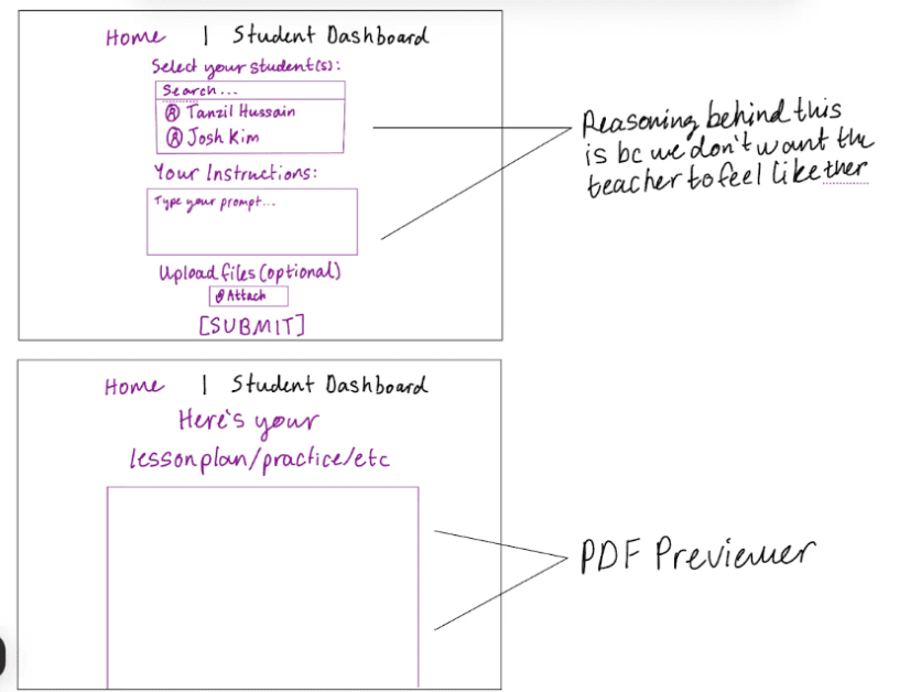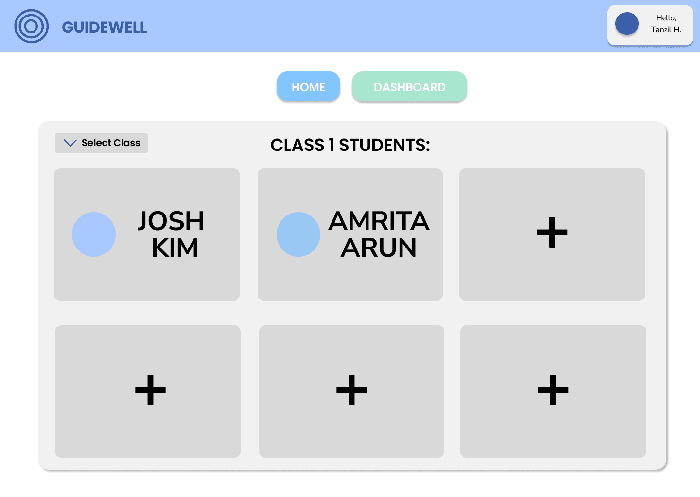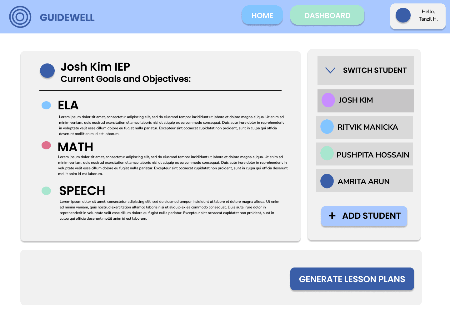 The dashboard is designed to focus on one student at a time to reduce visual clutter and cognitive overload. Teachers can switch between students using a clear, persistent side navigation panel.